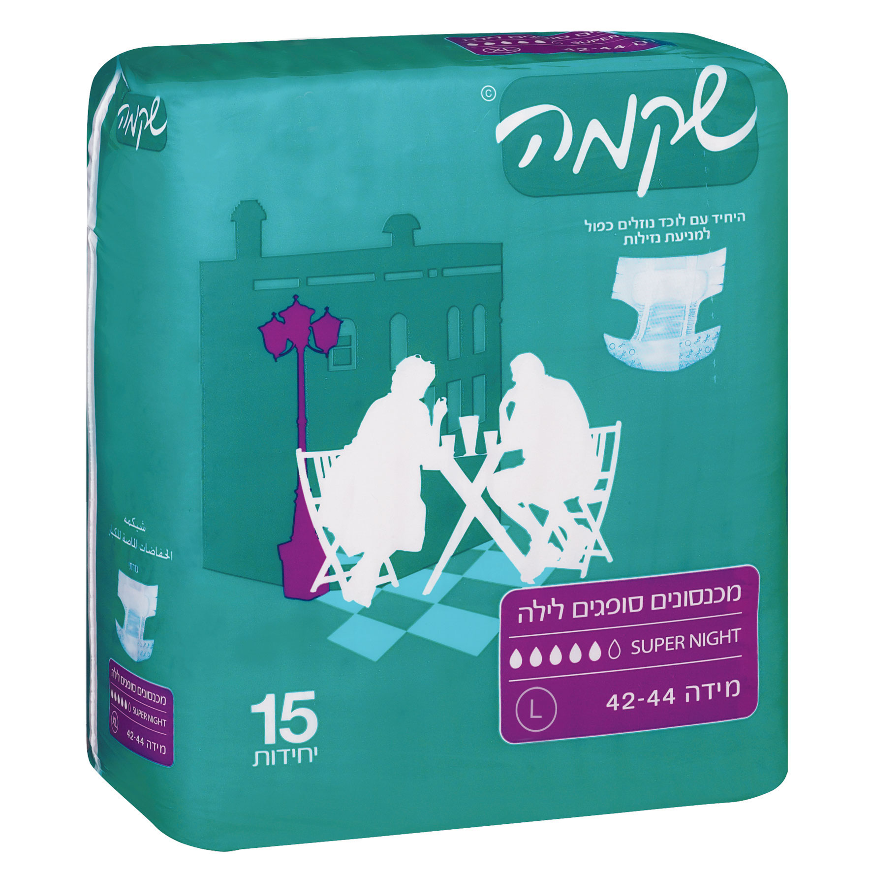 מכנסון (חיתול) גזרתי לילה – סופר נייט L של שקמה בעל כושר ספיגה של עד 8 שעות ומתאים לשימוש במהלך הלילה. למכנסונים שכבה פנימית וחיצונית דמוית בד נושמת ואוורירית, המסייעת במניעת גירויים, ולוכדי נוזלים כפולים המונעים נזילות. המכנסון מגיע עם מנגנון סגירה רב פעמית. • מידת מכנסיים 42-44 •